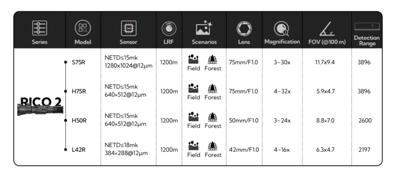 The RICO2 series thermal imaging riflescope is designed for hunters who demand the best in clarity, range, and comfort. Engineered with an industry-leading thermal imaging sensor and high frame rate, it delivers ultra-premium image quality that makes target identification and observation effortless. Its long focal length and built-in LRF ensure you can precisely engage distant targets, while an advanced optical design provides a distortion-free, immersive viewing experience. Featuring a stepless zoom lever and exceptional eye relief, the RICO2 series empowers hunters to seamlessly adjust magnification and stay comfortable during extended hunts. With its innovative technologies and user-centric design, the RICO2 series truly lets you “Hunt Beyond Boundaries.